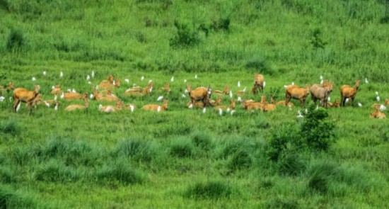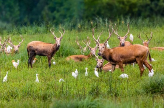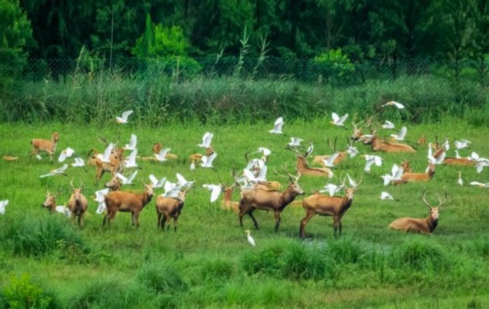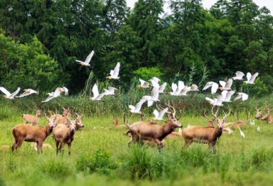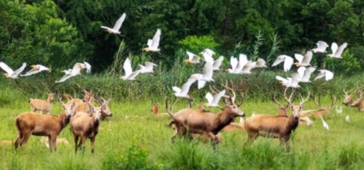 近日,大批鹭鸟栖歇在姜堰溱湖湿地公园麋鹿散养区,鹿鸟相依相伴、和谐共处,成为一道靓丽风景线。