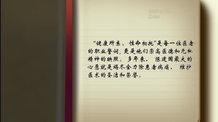 “健康所系、性命相托”是每一位医者的职业誓词,更是他们崇高医德和无私精神的映照。多年来,陈建国最大的心愿就是竭尽全力除患者病痛,维护医术的圣洁和荣誉,救死扶伤,不辞艰辛,执着追求,为祖国医药卫生事业的发展和人类身心健康奋斗终生。