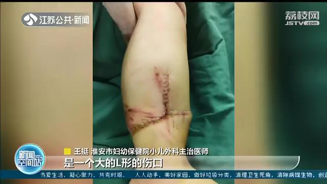 淮安市妇幼保健院小儿外科主治医师王挺说:“这个小孩来的时候,情况非常的紧急,家长双脚都是没有穿鞋,直接过来的。小孩的右小腿这儿,伤口触目惊心,是一个大的L形的伤口。直接把皮肤皮下一直拉到肌腱层,往后方撕开,脂肪和肌腱外露。”