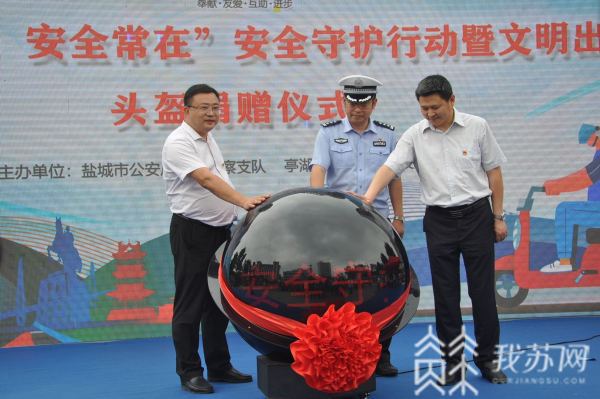 我苏网讯 7月20日下午,盐城市中心铜马广场上,上百名身着红马甲的创文和文明交通志愿者排成长队,依次领取安全头盔,这是盐城市公安局交警支队、盐城市亭湖区文明办主办的“一盔一带,安全常在”安全守护行动暨文明出行头盔捐赠仪式的现场。盐城市交警支队法宣科科长邵连华表示,“戴上头盔,系上安全带,只是一个小小的动作,但养成这样一个好习惯,却能在关键时刻拯救生命。”