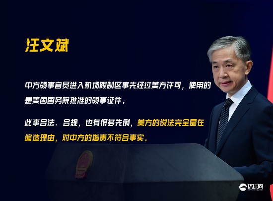 汪文斌称,中国驻美外交机构工作人员的个人信息都是公开透明的,中方领事官员进入机场限制区域事先经过美方批准,使用的是美方国务院批准的领事证件,目的是照料搭乘航班的中国公民。此事合法、合规,也有很多先例,美方的说法完全是在编造理由,对中方的指责不符合事实。