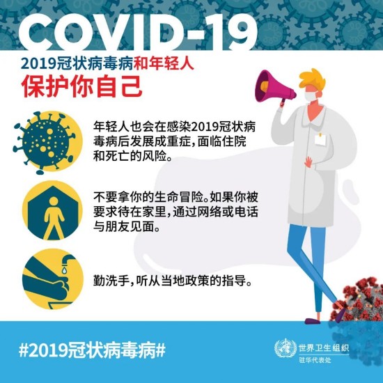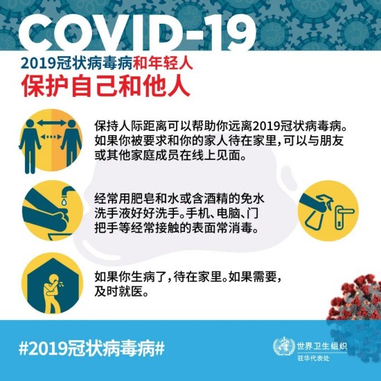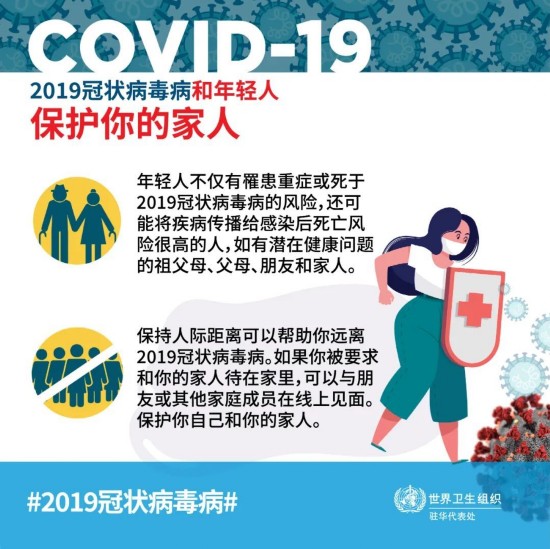 一旦感染了2019冠状病毒病,可能就会成为不幸感染重症的青少年中的一员,或者可能会将疾病传播给其他人,并使得他们身染重病甚至死亡。你有能力作出拯救生命的选择,年轻人同心协力,可以在抗击2019冠状病毒病中发挥重要作用。