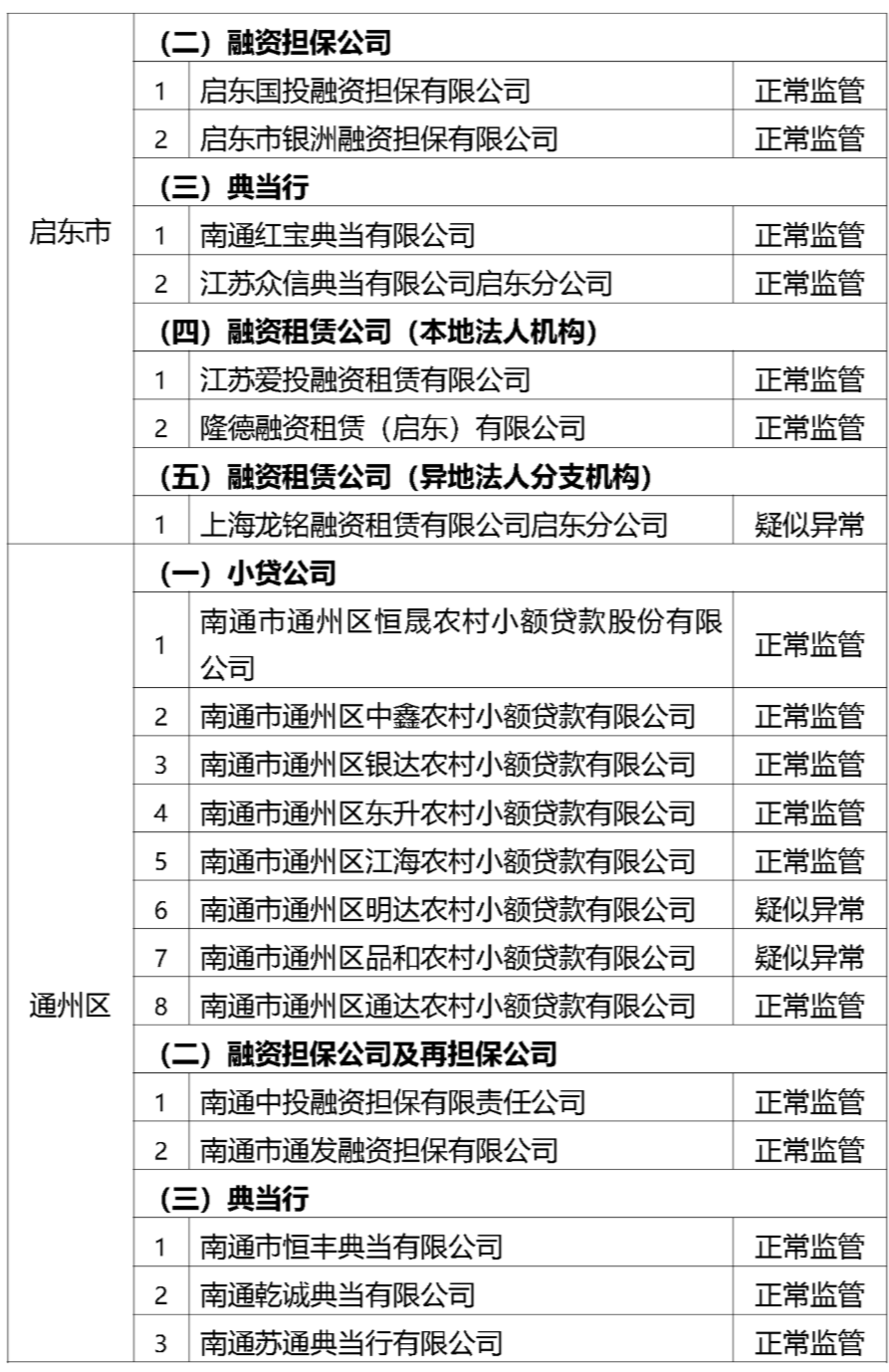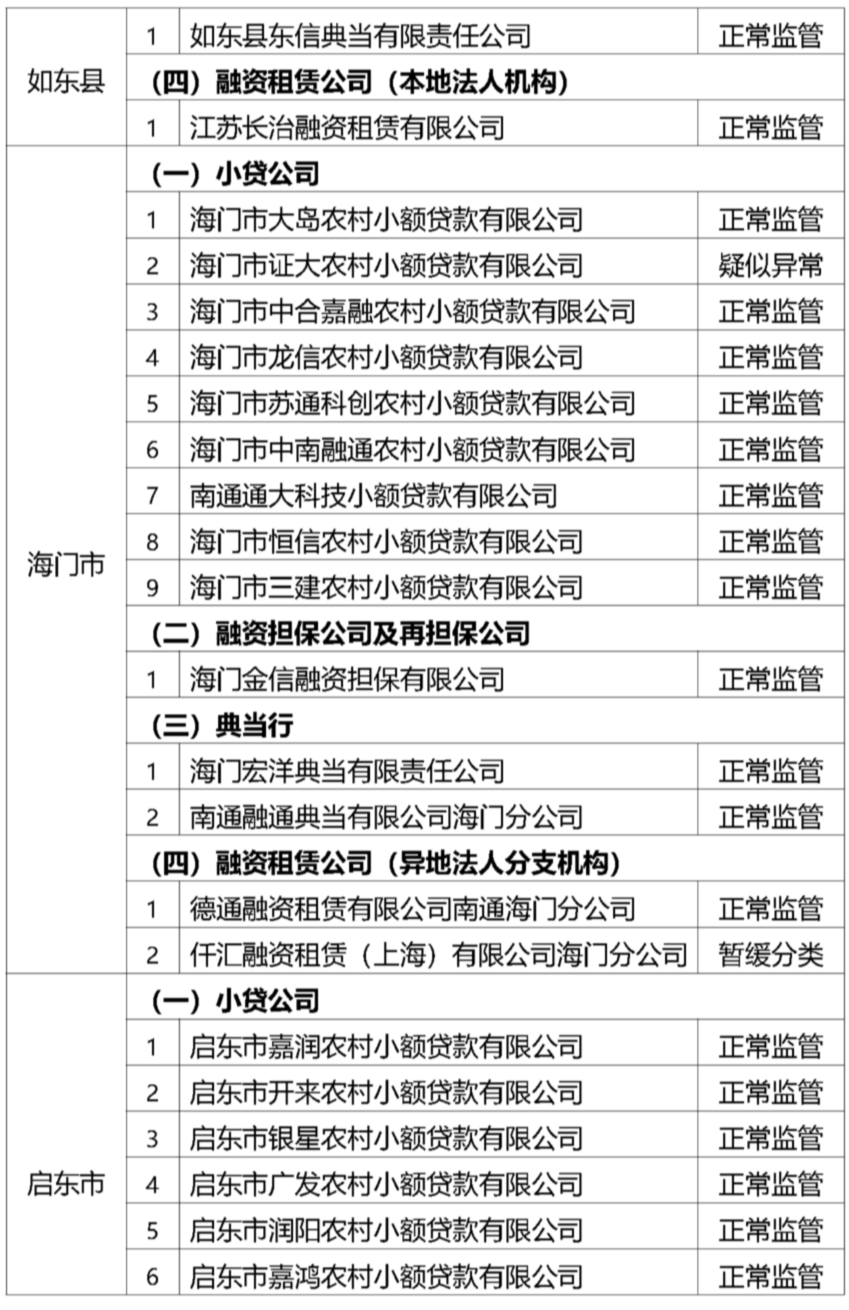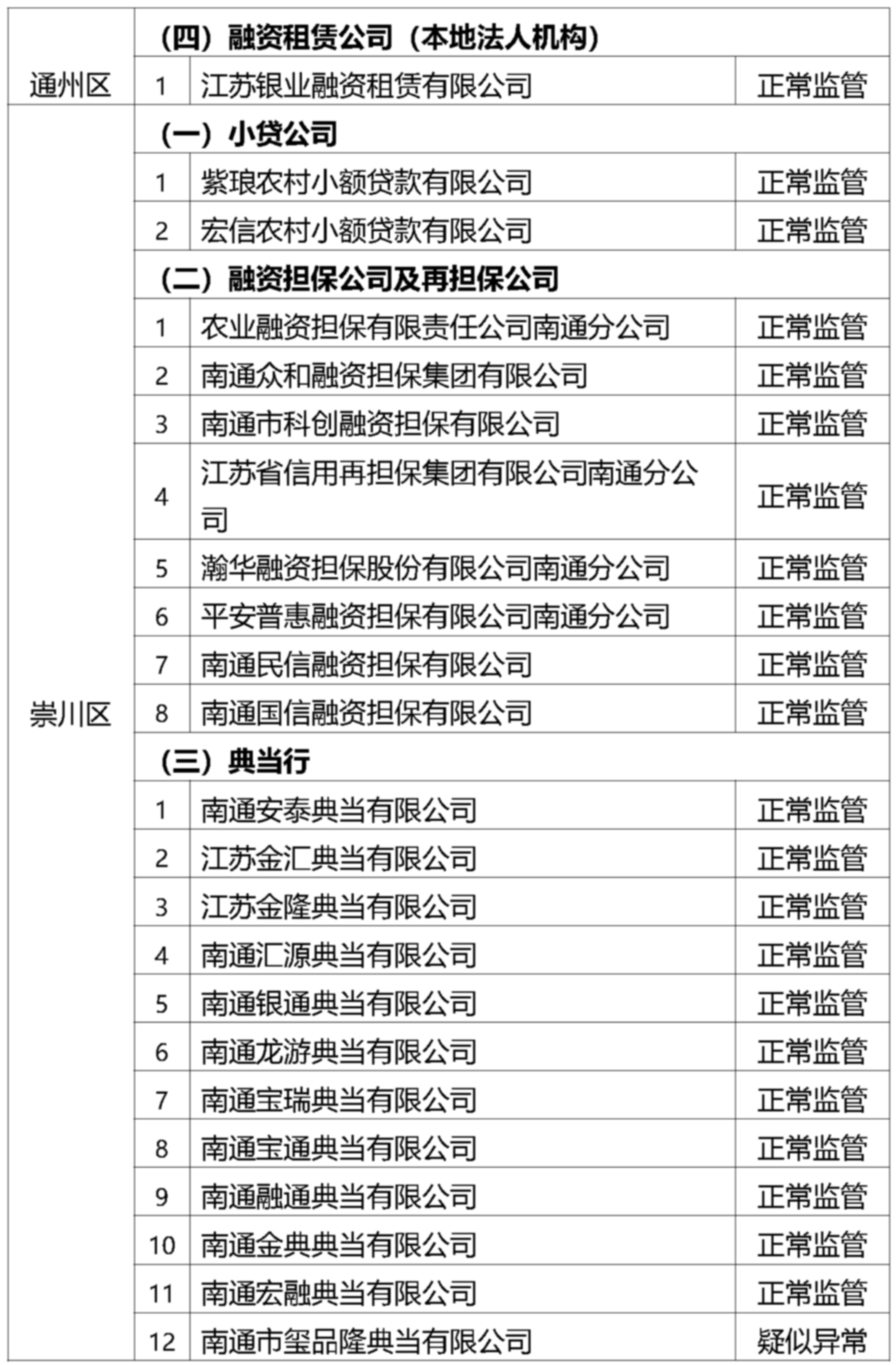 截至2020年6月,全市各类地方金融从业机构169家。根据《南通市地方金融从业机构监管分类办法(2020版)》,6月份,全市正常监管类机构123家,监管困难机构1家,疑似异常机构44家,暂缓分类机构1家。其中,典当行正常监管类29家,疑似异常1家;融资担保及再担保公司正常监管类22家;小贷公司正常监管类39家,疑似异常3家;融资租赁公司(本地法人)正常监管类22家,疑似异常18家;融资租赁公司(分支机构)正常监管类10家,监管困难1家,疑似异常22家,暂缓分类1家;农村资金互助合作社正常监管类1家。