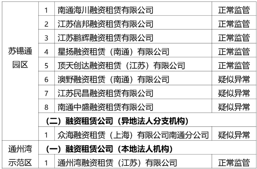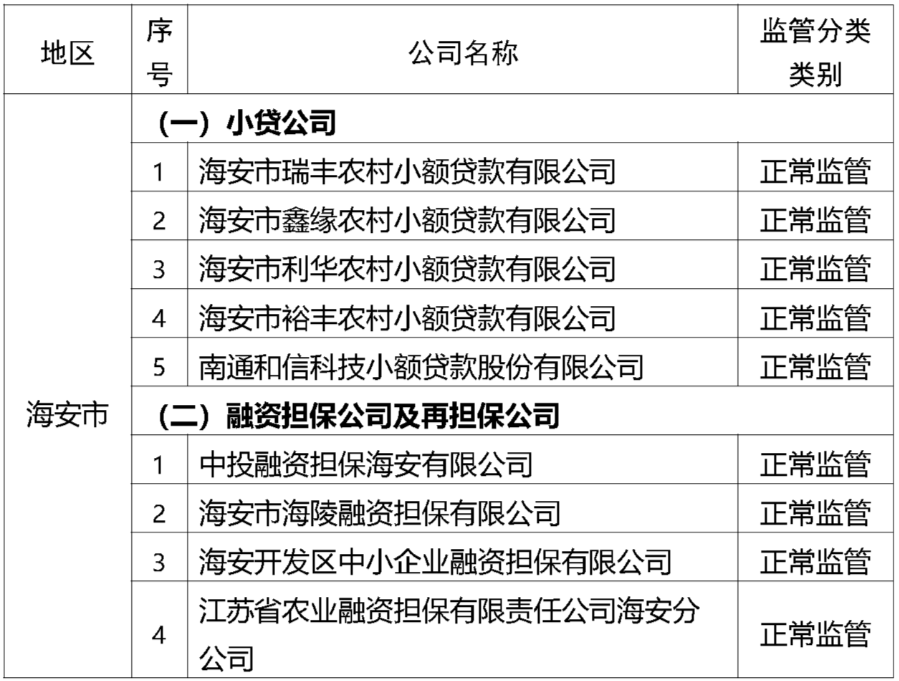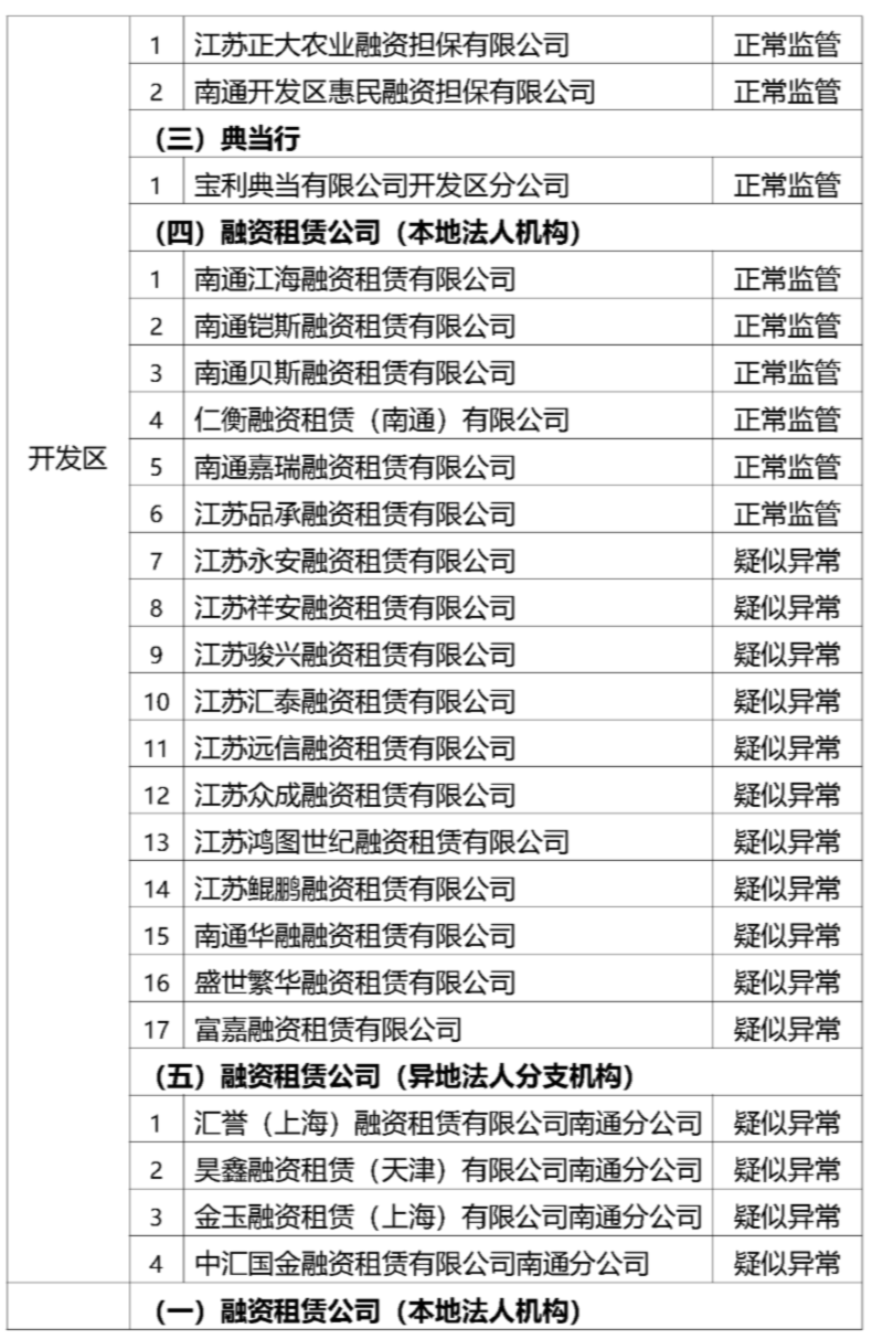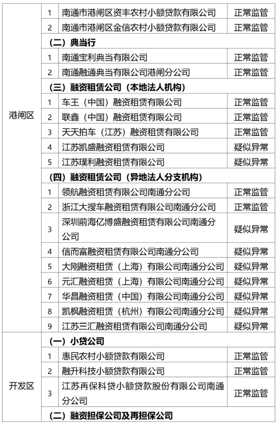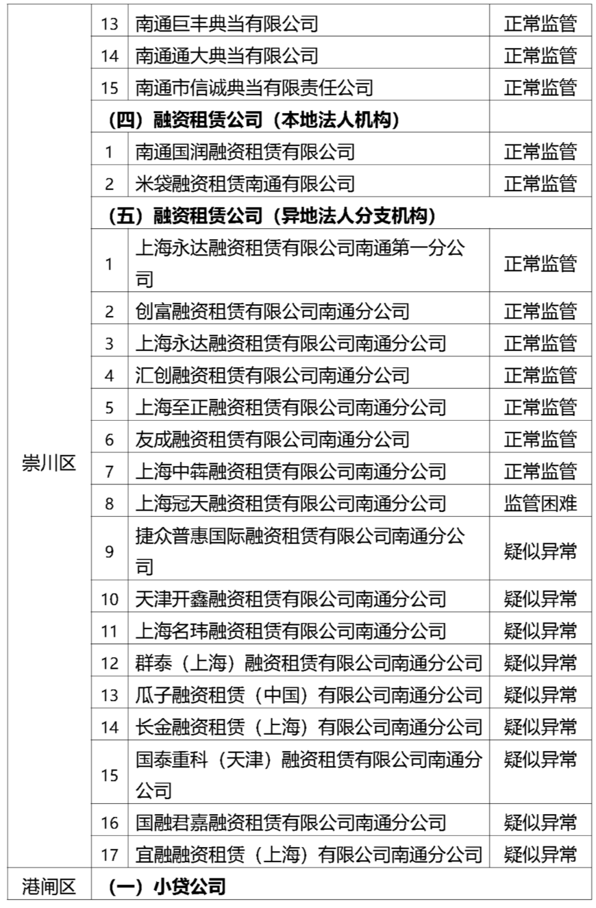 截至2020年6月,全市各类地方金融从业机构169家。根据《南通市地方金融从业机构监管分类办法(2020版)》,6月份,全市正常监管类机构123家,监管困难机构1家,疑似异常机构44家,暂缓分类机构1家。其中,典当行正常监管类29家,疑似异常1家;融资担保及再担保公司正常监管类22家;小贷公司正常监管类39家,疑似异常3家;融资租赁公司(本地法人)正常监管类22家,疑似异常18家;融资租赁公司(分支机构)正常监管类10家,监管困难1家,疑似异常22家,暂缓分类1家;农村资金互助合作社正常监管类1家。