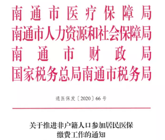 为认真贯彻落实《市政府办公室关于推动非户籍人口在城市落户的实施意见》(通政办发〔2020〕35号),努力实现农业转移人口在城镇落户和常住人口基本医疗保险全覆盖,现就推进非户籍人口参加居民医保缴费工作通知如下: