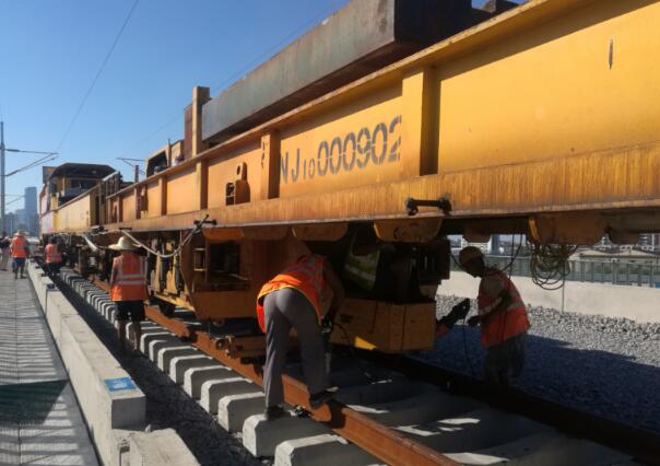 记者在位于市区美林湾附近连镇铁路镇江联络线看到,运轨机搭载着铁轨到达现场后,10多名工作人员立即就位。随着铺轨机缓缓前进,轨枕依次落下,钢轨也渐序"搭"在轨枕上。随后,坐在铺轨机下方的工作人员立即在枕槽中放入胶片,让钢轨稳固"着陆"。