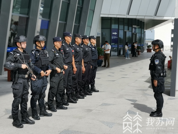 上午9点半,烈日当空。这样的桑拿天里,要数盐城市公安局的巡特警队员们穿得最厚。钢盔、作战服、皮靴、武装带一样不少,全套加起来不下于10公斤。