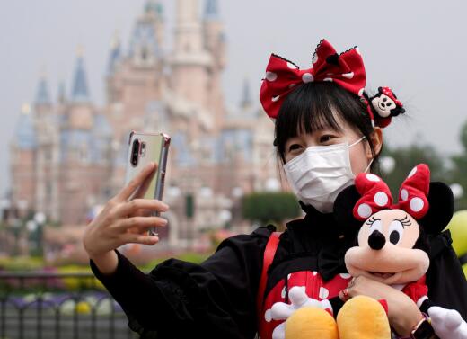 A visitor dressed as a Disney character takes a selfie while wearing a protective face mask at Shanghai Disney Resort as the Shanghai Disneyland theme park reopens following a shutdown due to the coronavirus disease (COVID-19) outbreak, in Shanghai, China May 11, 2020. [Photo/Agencies]