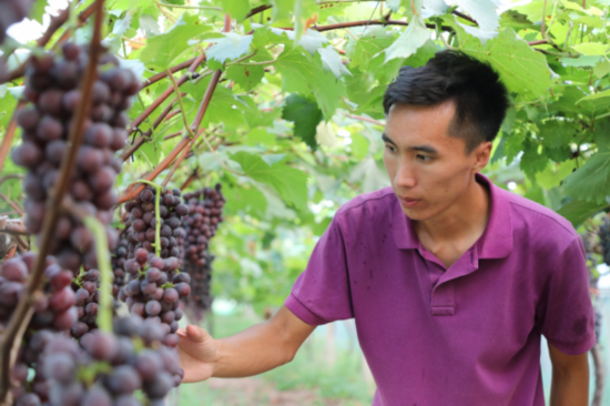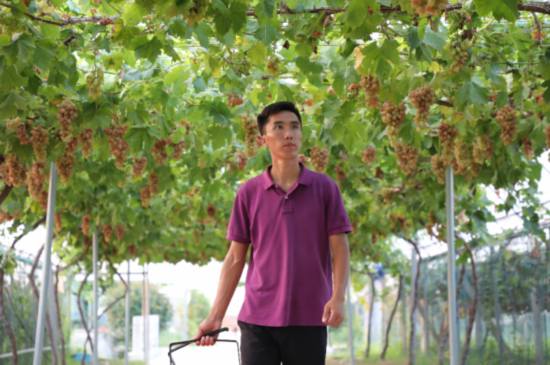初见毛天池的时候,他正骑着小三轮在自家的葡萄基地里来回穿梭,给上门采摘的客人帮忙送篮筐、运葡萄。偶尔,因为高个的原因,他还会顺手帮忙剪下客人心仪的葡萄串。瘦削的脸庞,健康的小麦肤色,典型的长期与阳光和土地打交道的农民形象。但又有别于传统农民“背朝黄土面朝天,吃饭还得靠老天”的生存方式,90后的毛天池,显然比父辈们更懂科技、也更有闯劲。