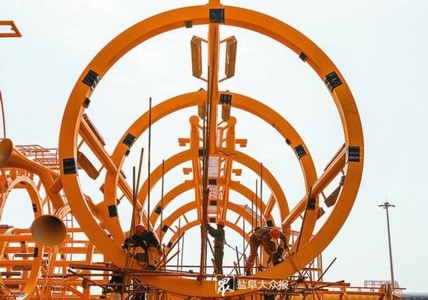 △长风海洋装备制造有限公司位于射阳县新能源及其装备产业园,专业生产风电设备导管架,具备年产基础桩、导管架及风电钢管桩100台(套)的生产能力。记者 郜野乔 摄