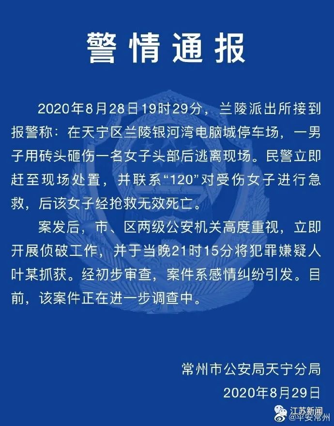 我苏网讯 据常州市公安局天宁分局8月29日发布的警情通报,2020年8月28日19时29分,常州兰陵派出所接到报警称:在天宁区兰陵银河湾电脑城停车场,一男子用砖头砸伤一名女子头部后逃离现场。民警立即赶至现场处置,并联系“120”对受伤女子进行急救,后该女子经抢救无效死亡。