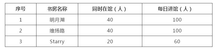 1.开放期间采取限流措施,各书房每日进馆人数和同时在馆人数详见下表,达到同时在馆人数上限后,将采取“出一进一”措施限流。