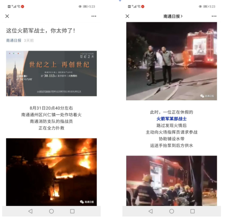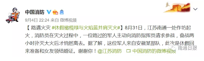 南通市消防支队通过微信公众号,找到这位不留姓名的现役军人。