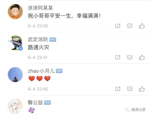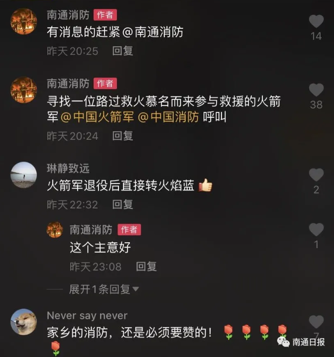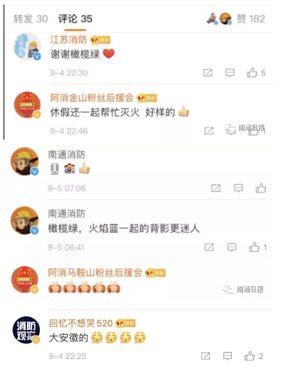之后,@南通消防在抖音和微博上发布了这则视频,休假橄榄绿与火焰蓝并肩灭火,引发了众多网友的点赞。