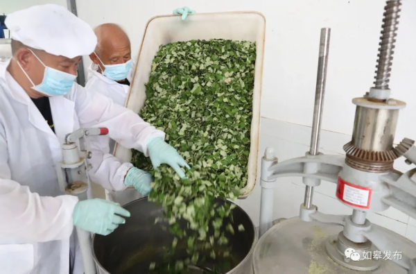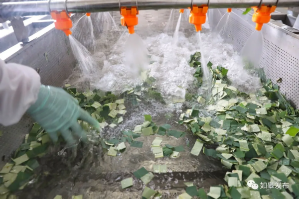 农民在车间将切碎的荷叶进行清洗