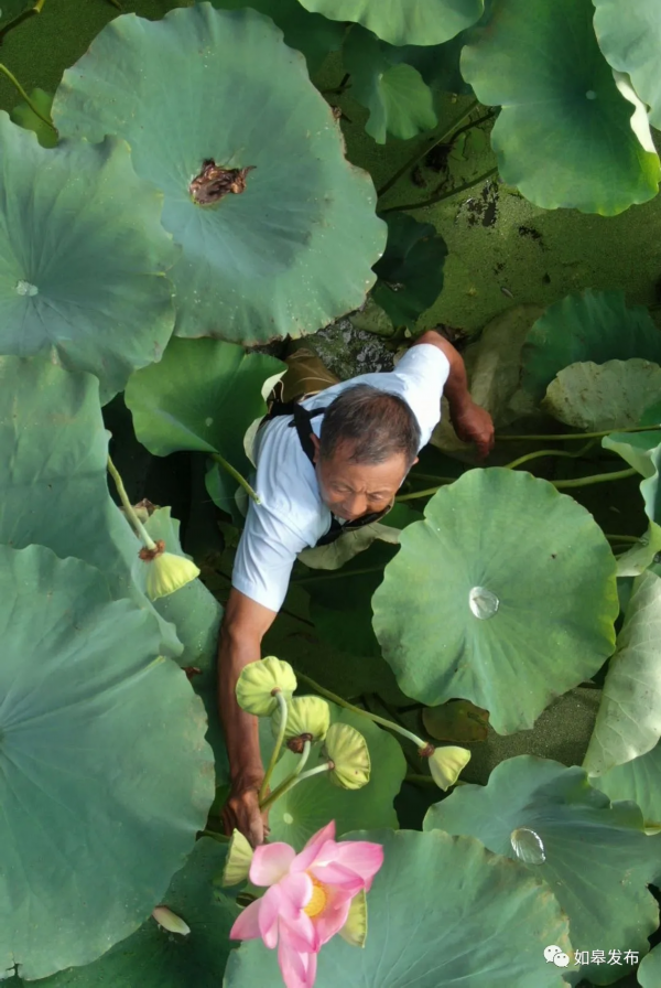 农民在采摘莲蓬、荷叶
