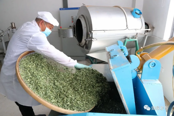 农民在车间利用机械对荷叶进行揉捻处理