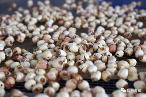 农民在车间挑拣已经烘干的莲子