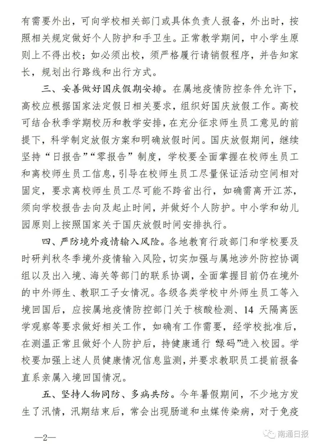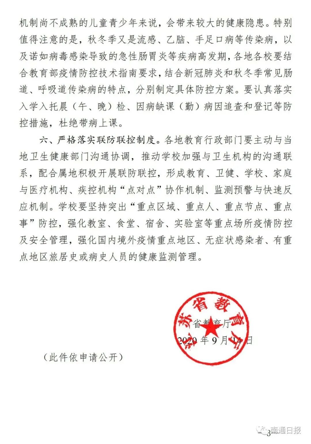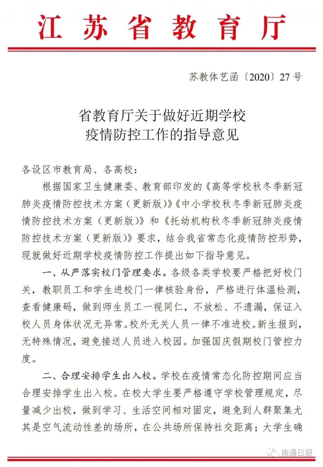 9月14日,江苏省教育厅发布《关于做好近期学校疫情防控工作的指导意见》。《意见》内容涉及从严落实校门管理、合理安排学校出入校、妥善做好国庆假期安排、严防境外输入风险、坚持人物同防、多病共防严格落实联防联控制度等方面。