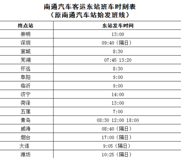 1.原南通汽车客运站始发班线(次)整体调整至南通汽车客运东站始发,省、市际班车发车时间不变,县际班车时间适度调整。