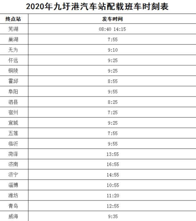 5.九圩港汽车客运停靠点途径配载班线(次):至芜湖、巢湖、无为、怀远、铜陵、霍邱、阜阳、泗县、宿州、宣城、五莲、临沂、菏泽、济南、济宁、淄博、潍坊、青岛、威海、烟台、大连、北京、天津、邯郸、邢台、漯河、长垣、叶县、许昌、临汾、襄樊、南昌、贵阳、武汉等省际客运班线。至南京(客运站)、高淳、金坛、句容、溧阳、镇江、扬州、泰州、黄桥、江都、靖江、泰兴、兴化、盱眙、泗洪、金湖、高邮、宝应、淮安、沭阳、睢宁、邳州、徐州、龙固、盐城、大丰、射阳、阜宁、涟水、滨海、灌南、东海等市际客运班线。