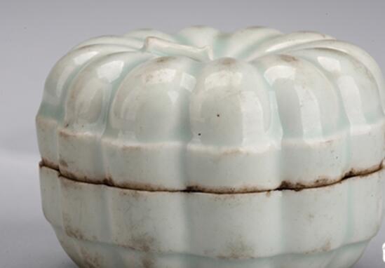 北宋青白釉瓜楞盒同样可以开合,其上下对合的12南瓜楞,盖顶有瓜藤装饰,平底。满施青白釉,胎体坚密细腻,釉色莹润如玉,造型优美逼真,此盒一般作为粉盒或香盒使用。