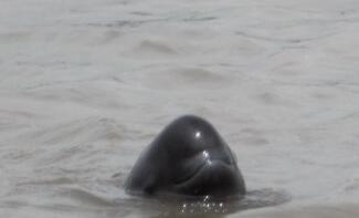 据江豚保护志愿者武先生介绍,上午9点多,南京下关滨江外滩江面上,数头幼江豚东游西窜,不时跃出水面探出黑黑的小脑袋微笑,突然一只幼江豚捕捉到一条大鳊鱼,用小嘴不停往下吞食,可是吞了半天也未吞下肚,最终还是让大鳊鱼逃溜走。