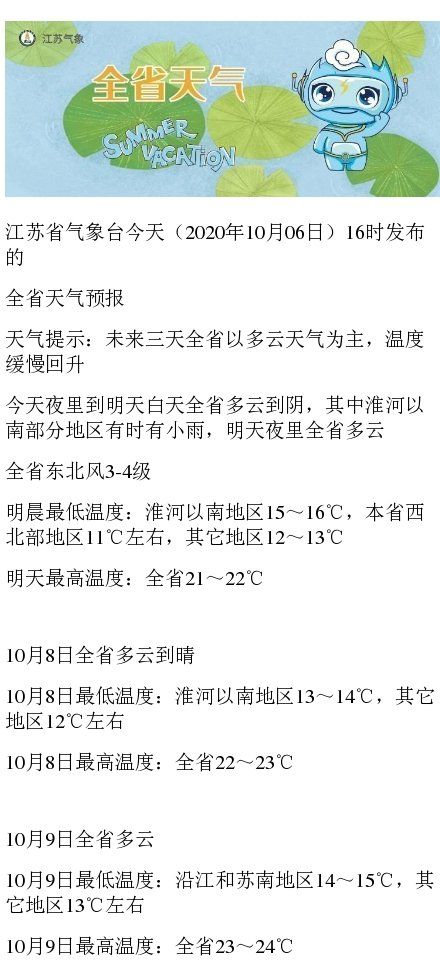 今天夜里到明天白天全省多云到阴,其中淮河以南部分地区有时有小雨,明天夜里全省多云,全省东北风3-4级。