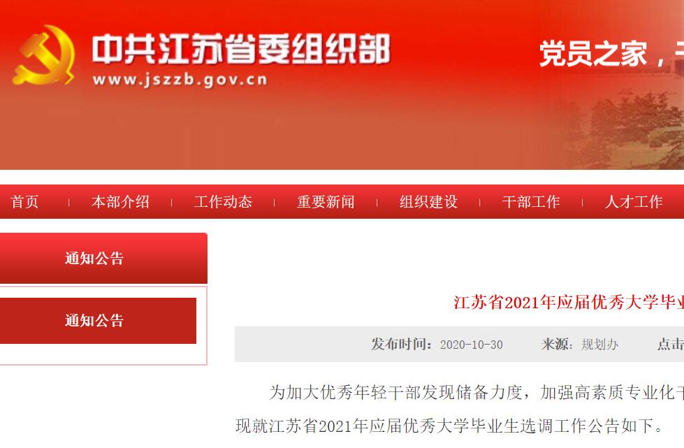 我苏网讯 10月30日,江苏省委组织部发布《江苏省2021年应届优秀大学毕业生选调工作公告》,2021年江苏将选调大学及以上学历应届优秀毕业生500名。