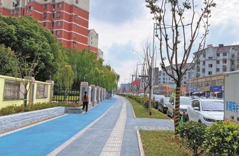 前进路北通兴昌路,南接新光路,全长1.2公里,是前进花园小区4000多户居民出行的必经之路,周边还有太湖花园一期和三期,这条路可以说是新吴区人流量最为集中的道路之一。虽然道路建设时间并不是特别长,但基础设施承载能力日渐下降。不仅沥青路面坑坑洼洼,停车秩序也比较乱,临街建筑外立面陈旧。随着长江路改造提升后,沿线街巷的提升也迫在眉睫。经过数个月的整治,江溪街道对前进路重新铺设沥青,并进行了人行道板彩色化改造、交通标识标线出新、停车位改造、绿化提升、通信管线入地等工程。如今,蓝色人行道板和健步道,红色停车位,让前进路变成了一条彩色路。江溪街道城管科相关负责人称,在道路部分节点布置了城市景观,比如,前进花园的滨水公园东侧整体包装出新,这些景观以党建为主题,用花境来修饰,成了当地特色景观。街道对前进路进行了“撤桶”,增设了生活垃圾分类收集房,新建了一座“城市驿站”,不仅有一类标准公共厕所,还设有环卫工人和城管队员休息处。据悉,接下来他们将启动前进路沿线店招出新以及店铺外立面出新改造,隐藏沿街店面空调外机和管线,对外立面粉刷修饰。