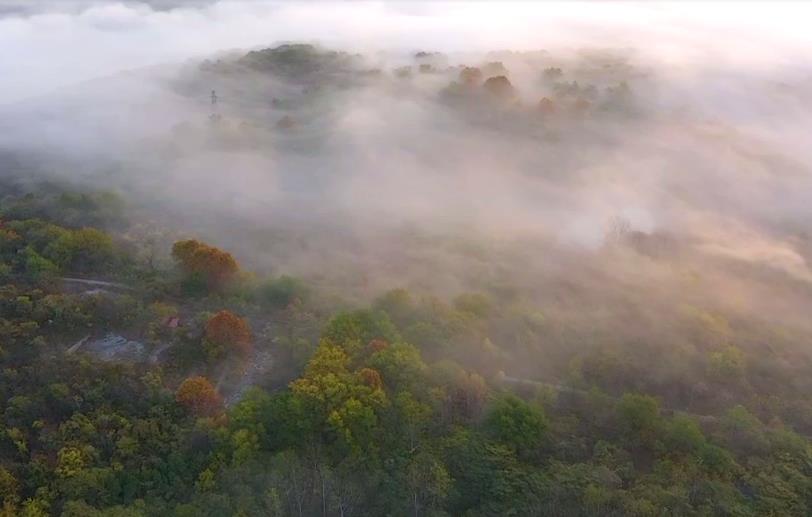 从空中俯瞰,群山环抱中的水库,整个水面是雾气蒸腾,不停地随风向下游流动,山林的树木和乡村的房屋在雾气中若影若现,宛如“仙境”一般。不时有快艇在水面上快速驶过,留下一道优美的弧线。