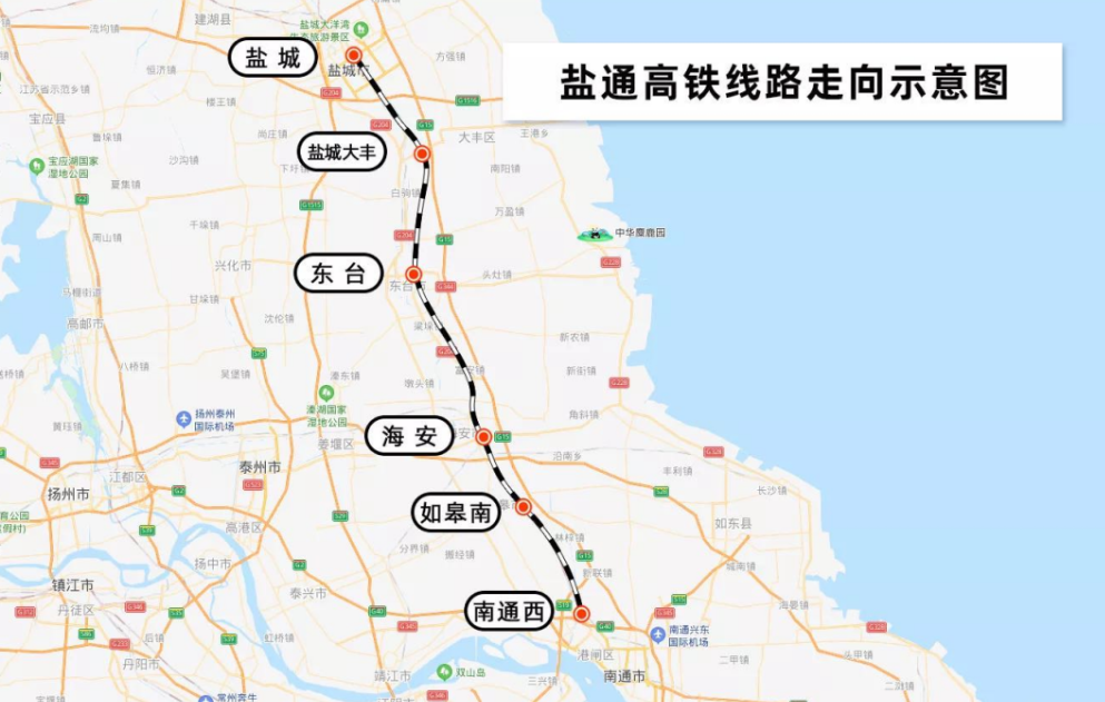 盐通高速铁路是中国“八纵八横”高铁网沿海铁路的重要组成部分,是服务“一带一路”建设和“长江经济带”的重要交通脉络,是苏北地区首条全线时速350公里的高铁。盐通高铁北起徐盐铁路盐城站,南至沪苏通铁路南通西站,设盐城、盐城大丰、东台、海安、如皋南和南通西等车站。正线全长156.6公里,设计时速350公里。