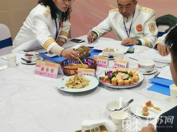 资深级注册中国烹饪大师、国家级一级裁判员、中式烹调高级考评员胡畏,中式烹调高级考评员包明献,中国注册烹饪大师陈剑敏,中国注册烹饪大师史美兰,南京工业大学浦江学院国际酒店与饮食文化学院院长钱晔等五名专业评委,按照口味、质地、造型、营养卫生、色泽等五方面对参赛菜肴进行品评。