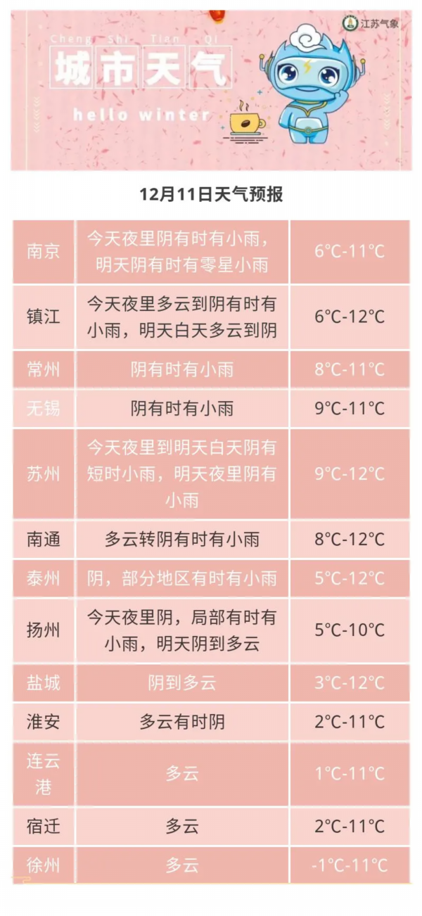 11日苏南地区阴有时有小雨,其它地区多云到阴,早晨江淮之间北部和淮北部分地区有雾。