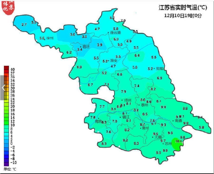 今天江苏各地最高气温多在10℃左右。晚上7点,淮北地区气温只有5℃左右,沿江和苏南地区8℃左右。最低气温出现在丰县,仅2.7℃。