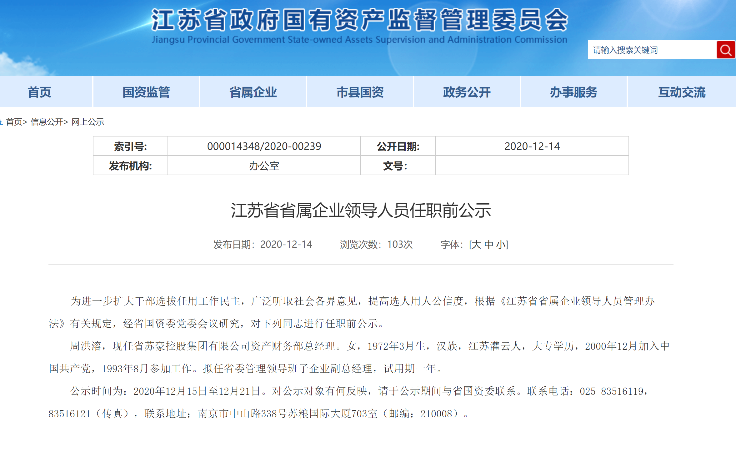 公示时间为:2020年12月15日至12月21日。对公示对象有何反映,请于公示期间与省国资委联系。联系电话:025-83516119,83516121(传真),联系地址:南京市中山路338号苏粮国际大厦703室(邮编:210008)。