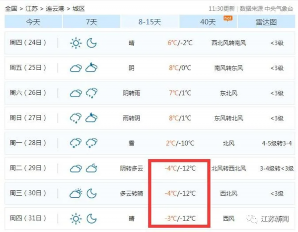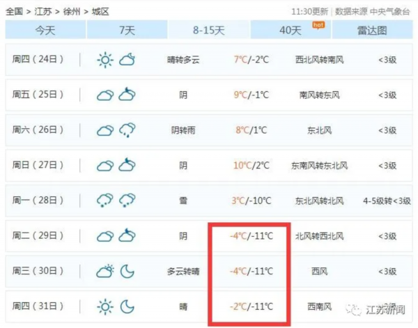 今天,一些网友发现,根据中国天气网上对于未来8-15天的天气预测,本月底江苏多地最低气温将会低至-10°C左右!