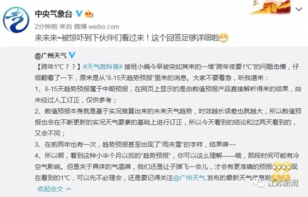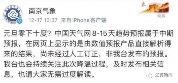 官方回应来了!12月17日中午,南京市气象局官方微博发布消息称:“中国天气网 8-15 天趋势预报属于中期预报,在网页上显示的是由数值预报产品直接解析得来的结果,尚未经过人工订正,非我台发布的预报。”同时,南京市气象台也会持续关注此次降温过程,及时发布相关信息,请大家无需过度解读。