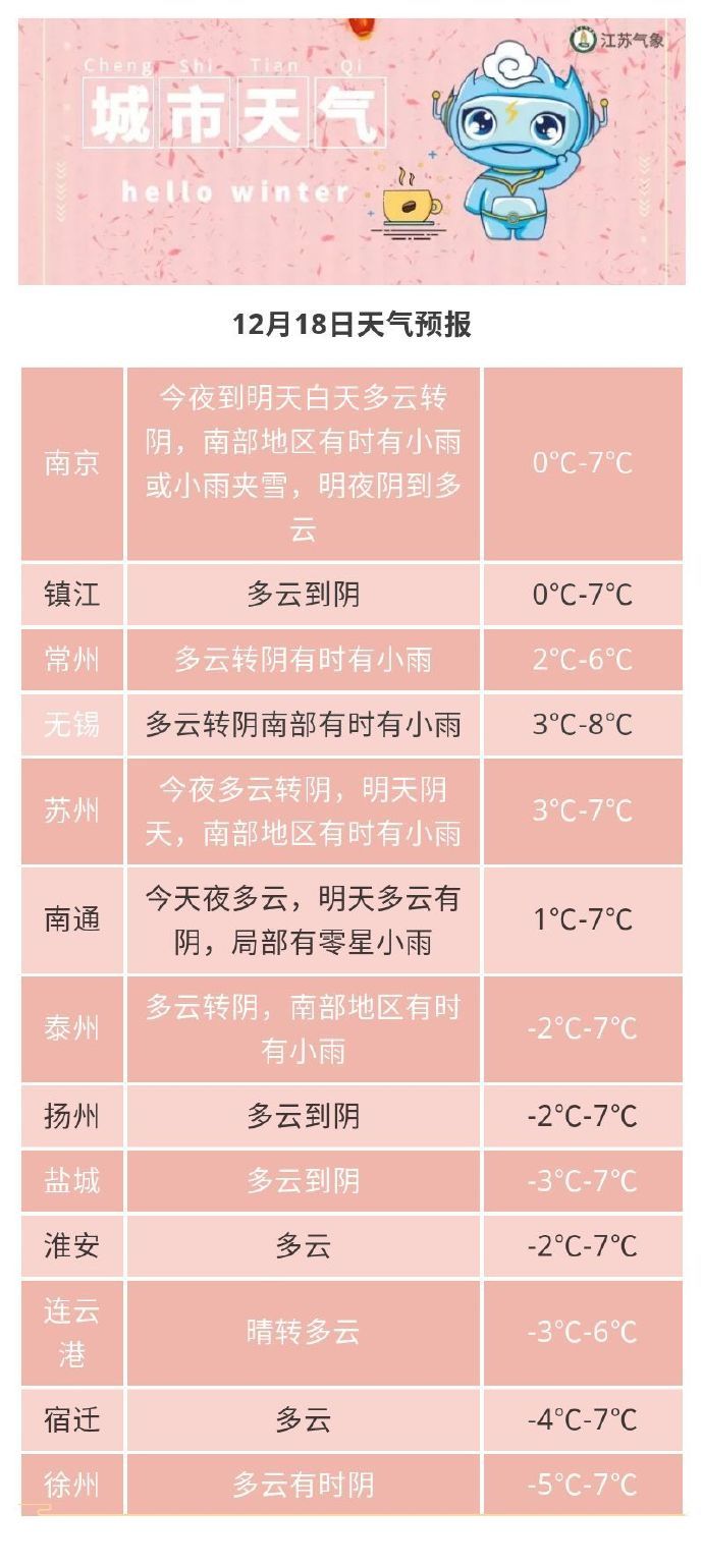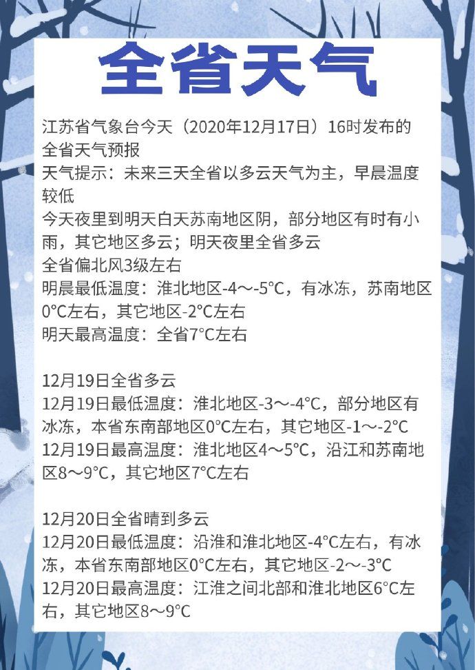 来看江苏省气象台12月17日16时发布的最新天气预报: