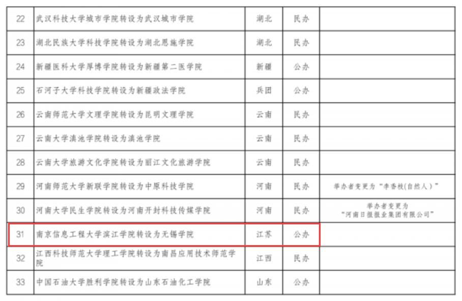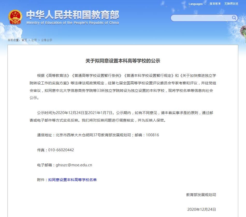 我苏网讯 今天(12月24日),教育部发展规划司发布《关于拟同意设置本科高等学校的公示》,拟同意南京信息工程大学滨江学院等33所独立学院转设为独立设置的本科学校。公示时间为2020年12月24日至2021年1月7日。