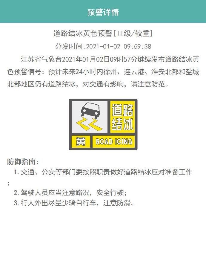 我苏网讯 江苏省气象台2021年01月02日09时57分继续发布道路结冰黄色预警信号:预计未来24小时内徐州、连云港、淮安北部和盐城北部地区仍有道路结冰,对交通有影响,请注意防范。