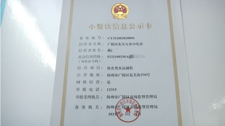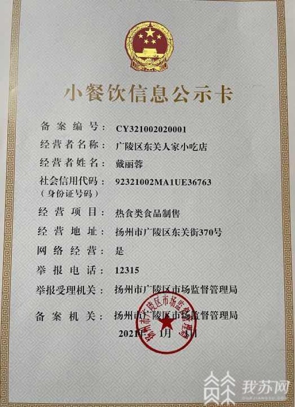 记者今天(1月2日)从扬州市市场监管局获悉,2021年1月1日广陵区“东关人家小吃店”的老板殷先生从扬州市市场监管局食品安全总监洪昊手中接过“小餐饮信息公示卡”,这也是全省首张小餐饮信息公示卡。