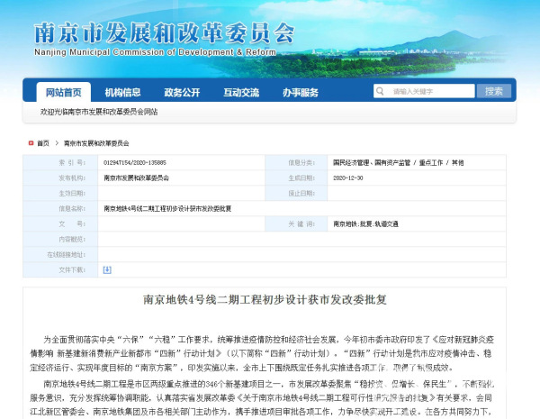 我苏网讯 记者今天从南京市发改委了解到,2020年12月30日,南京地铁4号线二期工程初步设计获得正式批复,这也是继该项目在2020年12月初发布工程施工招标后的最新进展。