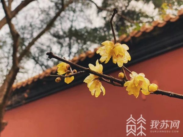 据了解,在明孝陵,蜡梅是成片栽植的,从文武方门起,经孝陵殿、内红门、明楼,直到宝顶,每两座建筑之间的空地都栽上了蜡梅。一枝一朵,疏密有致。尤其是,在明孝陵文武方门后面的红墙处,黄色蜡梅与红色宫墙相互映衬,格外美丽。