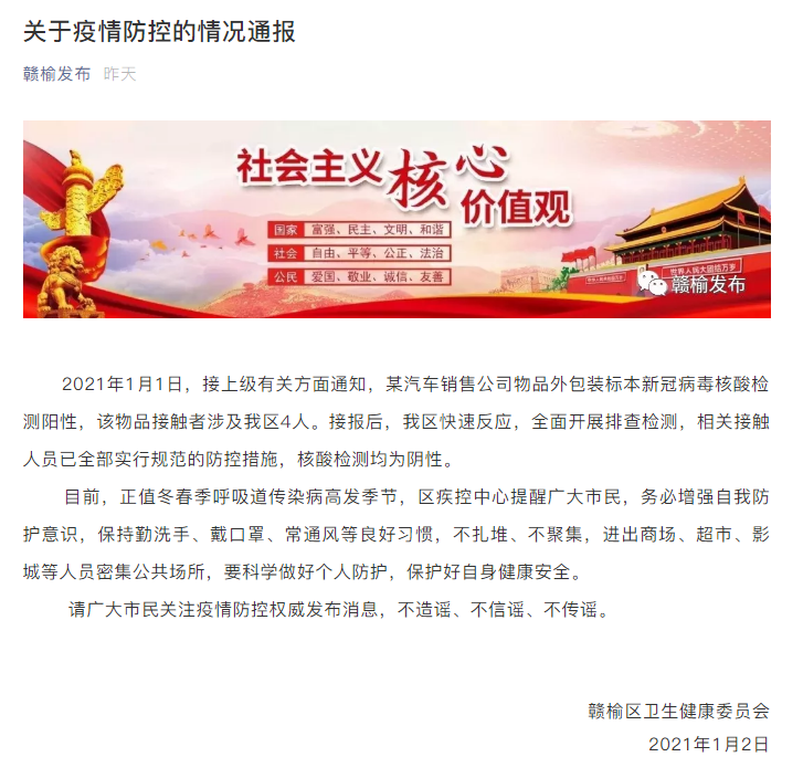 2021年1月1日,接上级有关方面通知,某汽车销售公司物品外包装标本新冠病毒核酸检测阳性,该物品接触者涉及我区4人。接报后,我区快速反应,全面开展排查检测,相关接触人员已全部实行规范的防控措施,核酸检测均为阴性。