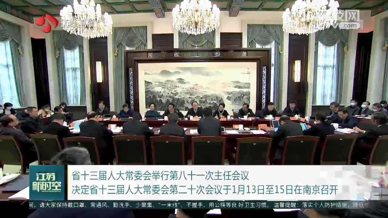 会议听取了关于省十三届人大常委会第二十次会议议程草案和日程安排意见的汇报,决定会议于1月13日至15日在南京召开。建议议程为:审议中国(江苏)自由贸易试验区条例等草案修改稿;审议省政府关于2020年民生实事项目实施情况的报告并开展工作评议;审议江苏省人民代表大会常务委员会工作报告(稿);审议关于提请审议江苏省第十三届人民代表大会第四次会议议程(草案)、主席团和秘书长名单(草案)、列席人员范围(草案)的议案;审议江苏省第十三届人民代表大会常务委员会代表资格审查委员会关于个别代表的代表资格的报告;审议省政府、省法院、省检察院和省人大常委会人事代表联络委员会关于省十三届人大三次会议代表建议、批评和意见办理情况的报告等。
