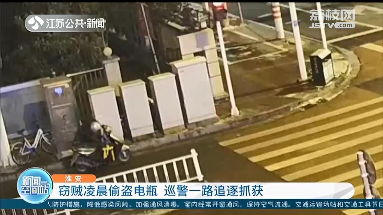 1月3号凌晨3点左右,在淮安市区环宇路与和平路交汇处,正在巡逻的民警发现路边有两人行迹可疑。监控画面显示,其中一人驾驶摩托车停在路边四处张望,另一人正在拆卸一旁电动车上的电瓶,二人听见警车鸣笛后慌忙逃跑。
