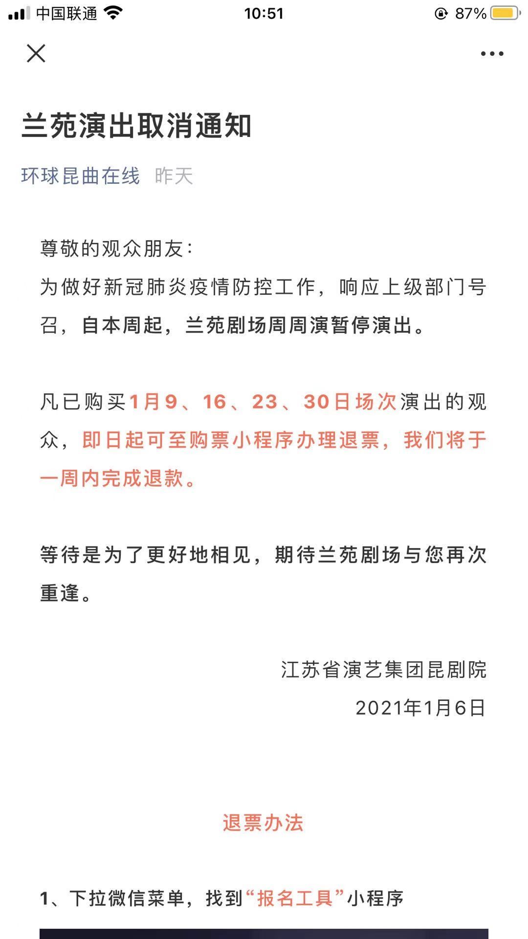 昨天14点13分,江苏省昆剧院官方微信“环球昆曲在线”发布公告:自本周起,兰苑剧场周周演暂停演出。凡已购买1月9、16、23、30日场次演出的观众,即日起可至购票小程序办理退票,并将于1周内收到退款。