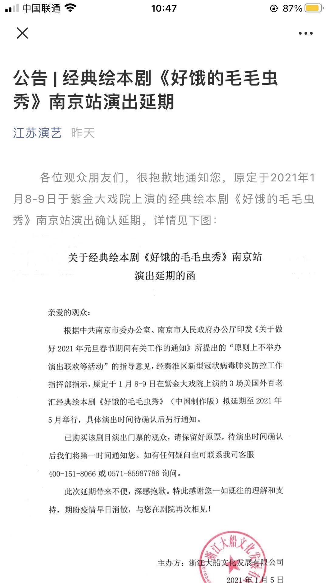 当天16点26分,省演艺集团苏演票务公司官微“江苏演艺”发布公告:原定于2021年1月8-9日于紫金大戏院上演的经典绘本剧《好饿的毛毛虫秀》南京站演出确认延期。