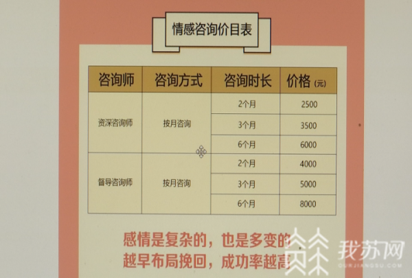 资深咨询师收费2500到6000元,督导则是4000到8000元,服务时长从2个月到6个月不等,具体内容包括缓和关系、碎冰、吸引术和重新建立舒适感。所谓咨询助理强调,“这是一个系统性工作”。在简单询问记者的感情背景后,助理开始详细询问记者分手原因。